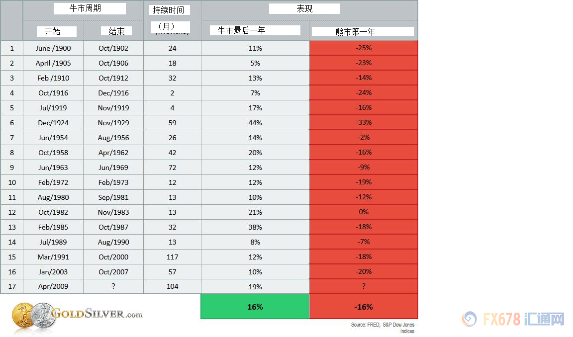 Jeff Clark找出了标普500指数自1900年以来所有的牛市周期数据,然后观察了每一个牛市周期结束后的第一年发生了什么。换句话说,在牛市周期的最后一年结束后,熊市周期的第一年股市会发生什么?如果2017年是牛市周期的顶峰的话,这些数据将非常有用。