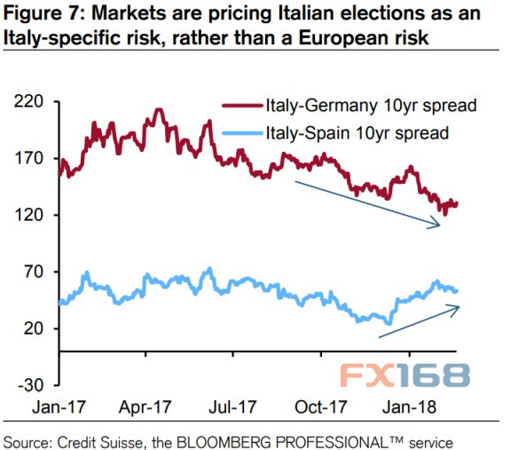 瑞信的Marino和Jiang警告说,市场可能低估了选举产生混乱结果的风险。债券收益率表明,市场认为意大利大选是一种孤立的风险,而非欧洲风险。