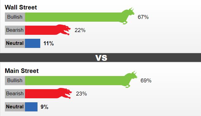 在针对华尔街专业人士的调查中,有18人参与了调查,有12人,或67%认为本周黄金将会上涨,有4人即22%认为本周黄金将会下跌,2人或11%认为黄金将会盘整。市场参与者中包括黄金交易商,投行,期货交易员及技术分析师。在针对普通投资者的调查中,有809人参与了调查,有557人,或69%认为本周黄金将会上涨,有183人即23%认为下周黄金将会下跌,69人或9%认为黄金将会盘整。
