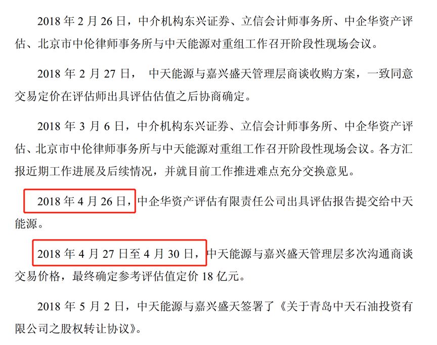 好吧,退一步,就算中天能源的逻辑是成立的。但是,时间对不上啊。不信我们来看证据。根据中天能源回复问询时披露的信息,2018年4月30日确定了“定价18亿元”,但是披露不构成重大资产重组的公告到5月3日才发出,中间还差着2天呢?截图如下:
